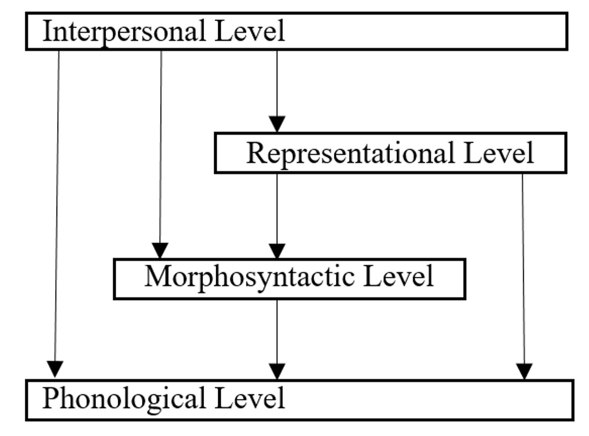 The Interpersonal Level (IL) is responsible the distinctions of formulation related to the interaction between speakers and addressees. The Representational Level (RL) takes care of designation and all semantic aspects of the grammar of a language. The Morphosyntactic Level (ML) and the Phonological Level (PL) deal with the formal aspects of a linguistic unit. The top-down FDG architecture shows that much of what happens in Morphosyntactic and Phonological Levels is motivated by the levels of Formulation, i.e., the Interpersonal and Representational Levels.